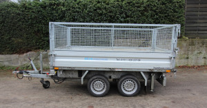 Vermietet wird ein Humbaur Dreiseitenkipper mit zulässiger Gesamtmasse von 2,7 Tonnen. Der Hänger lässt sich elektrisch-hydraulisch kippen und hat eine Not-Handpumpe. Der Hänger wird mit Gitteraufsatz und Auffahrrampen vermietet.