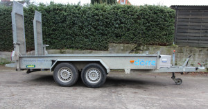 Vermietet wird ein Unsinn Tieflader mit zulässiger Gesamtmasse von 3 Tonnen. Der Hänger ist mit verstellbaren Auffahrrampen und Stützen ausgestattet.